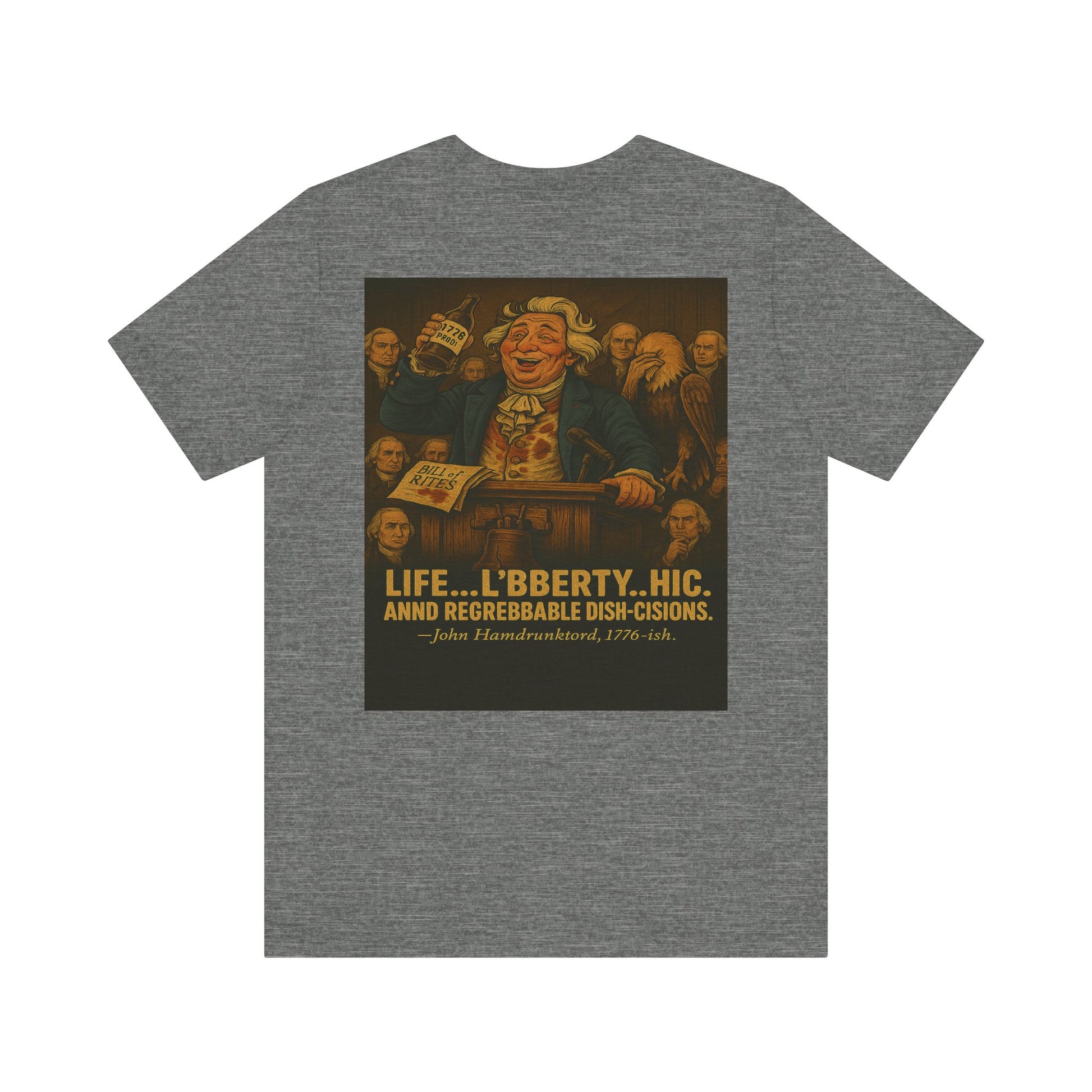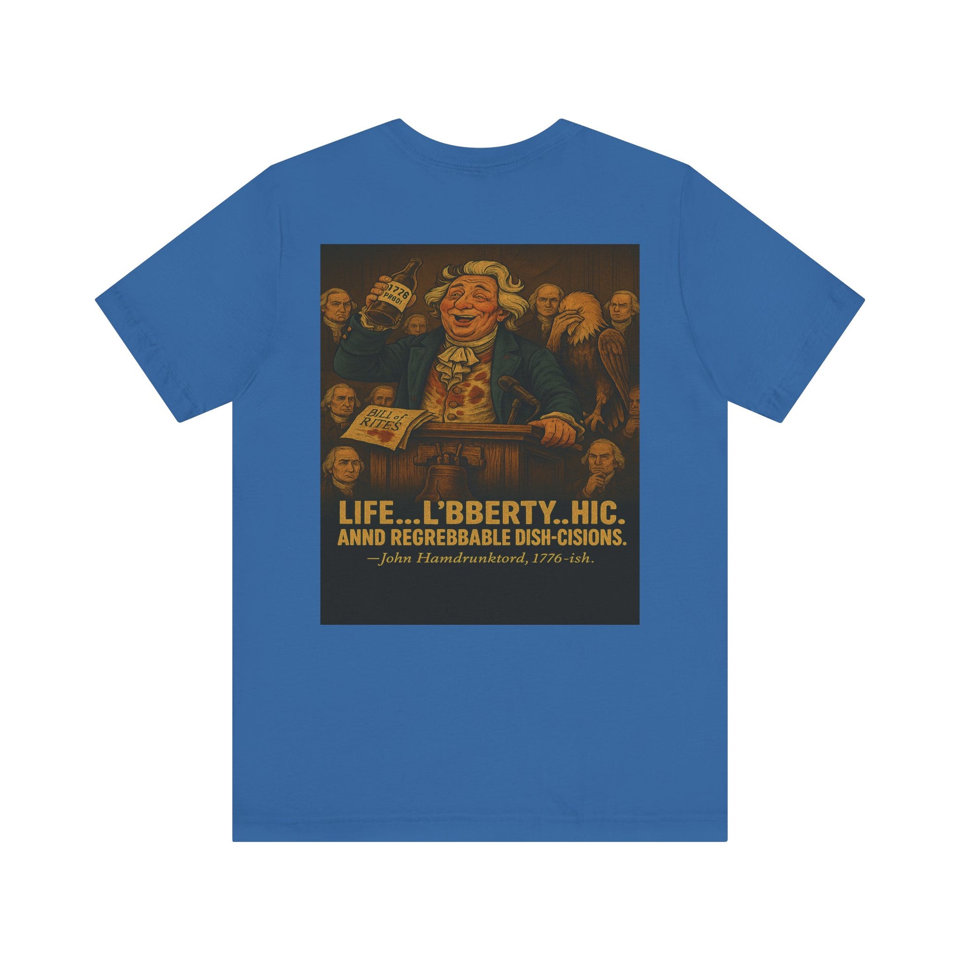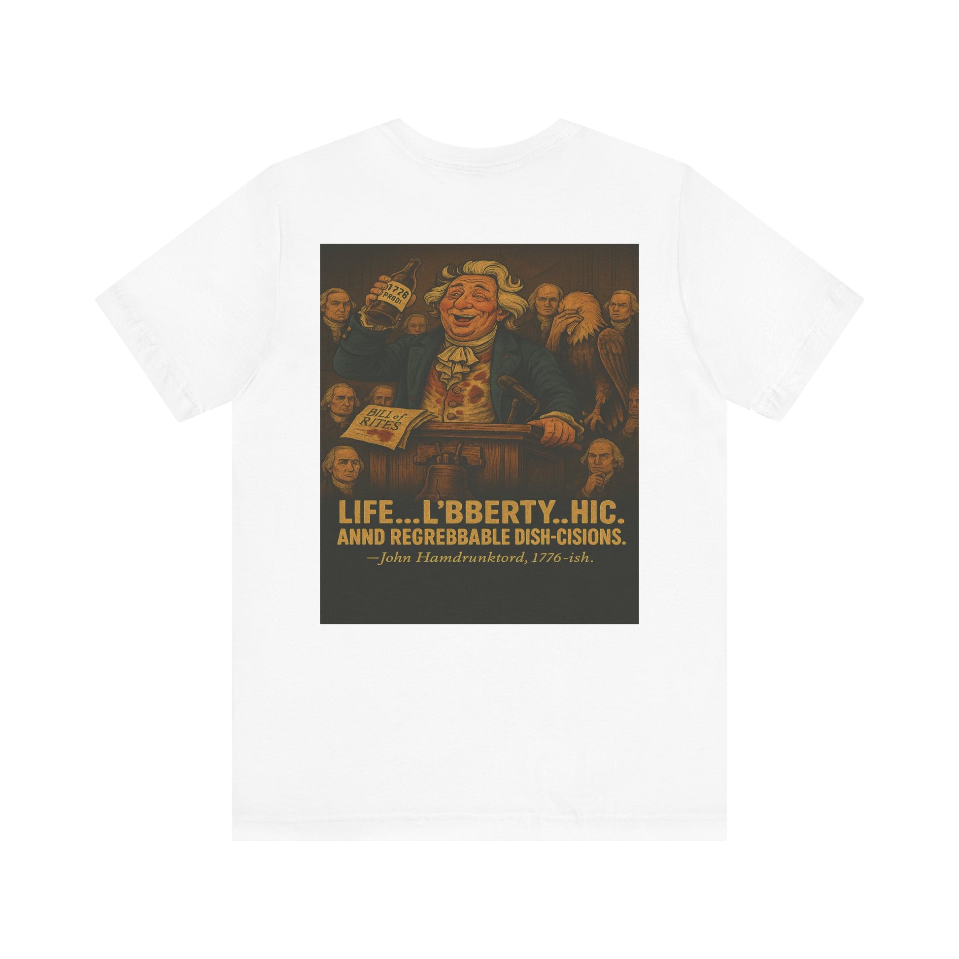 Right as he's about to sign the sacred Bill of Rites, our hero spills 1776-proof whiskey all over the parchment, his vest, and his dignity. Undeterred, he slurs out a toast to “L’BBERTY… HIC… and REGREBBABLE DISH-CISIONS!” while an eagle facepalms and the rest of the founding fathers regret showing up. Spoiler: he never signs the damn thing.